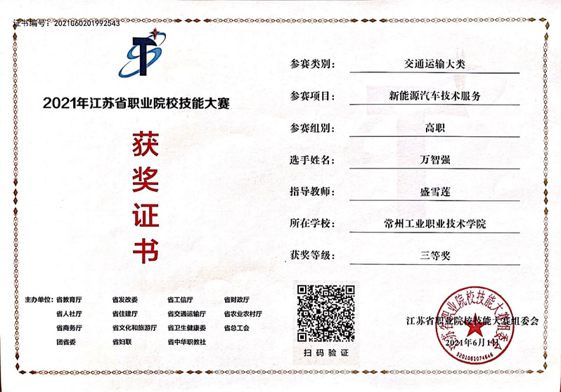 学生积极参加各类技能技术比赛,获得江苏省职业院校技能大赛“新能源汽车技术”三等奖。