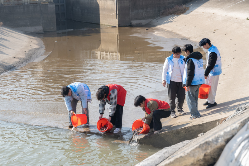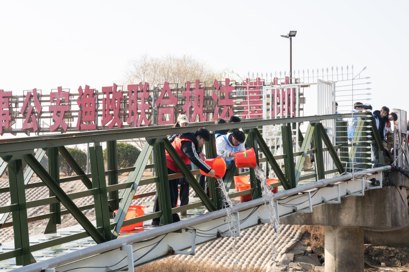 活动现场暖意融融、秩序井然。志愿者们分工明确、协作默契,将一桶桶鱼苗从运输车上平稳转运至江边。在执法警官的监督与工作人员的专业指引下,大家小心翼翼地将鱼苗缓缓倾倒入水,一尾尾鲜活的鱼苗融入滚滚江流,为母亲河注入蓬勃生机。