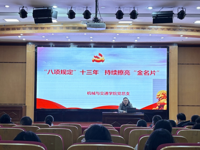 为筑牢全院师生党员廉洁自律思想防线,推动党风廉政建设走深走实,12月11日,机械与交通学院党总支书记陈晓敏为全体教职工讲授 “中央八项规定十三年,持续擦亮‘金名片’”专题党课。