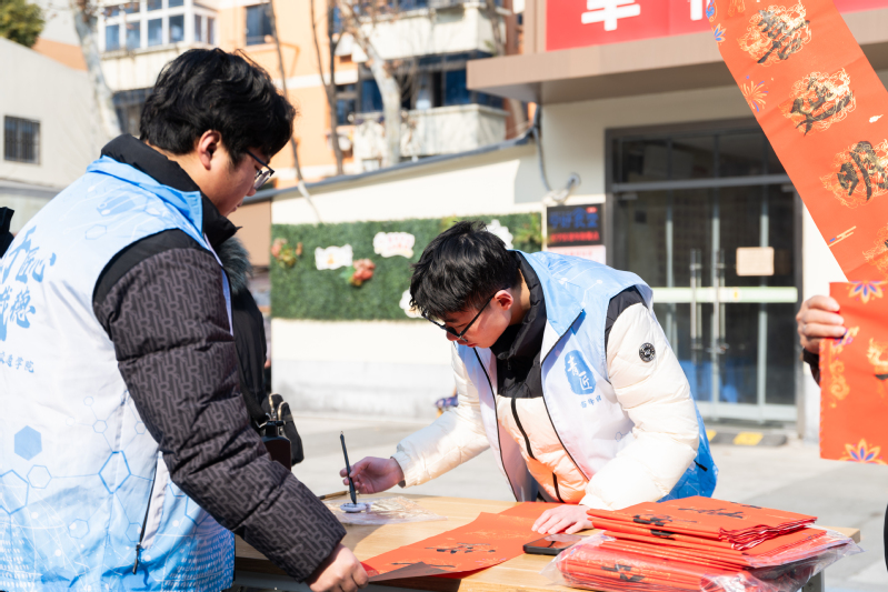 与此同时,社区党群服务中心内热闹非凡。书法社团的志愿者们挥毫泼墨,笔走龙蛇,一副副寓意吉祥的春联跃然纸上,引得社区居民纷纷驻足围观、排队领取,每个人都如愿拿到心仪的对联,喜悦之情溢于言表。串珠社团的精美作品则吸引了众多小朋友的目光,志愿者们一边向孩子们生动讲解串珠的制作过程,一边通过趣味游戏互动,将小巧精致的串珠作品作为礼品送给孩子们,欢声笑语充斥着整个服务中心。