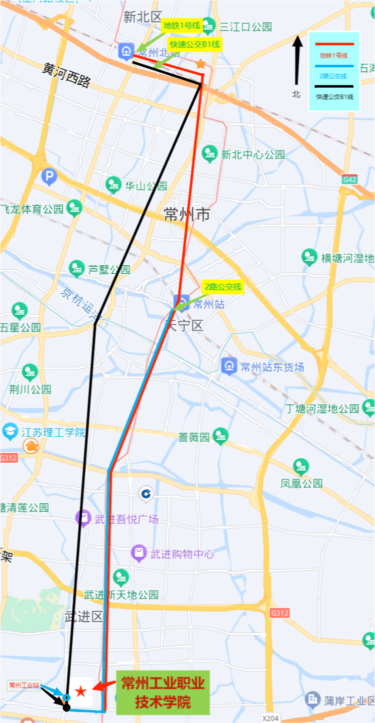 校名:常州工业职业技术学院(原常州轻工职业技术学院) 地址:常州市武进区鸣新中路28号(常州科教城内) 交通:1、常州汽车站、常州火车站北广场乘2路公交车至“工业学院西门(轻工学院西门站)”下。 2、常州汽车站、常州火车站北广场或常州火车站南广场乘快速公交B11至“兰陵站”换乘快速公交B1至“工业学院西门(轻工学院西门站)”下。 3、常州火车站北站、常州汽车站、常州火车站北广场乘地铁1号线至常州科教城南下,换乘B1/2路至“工业学院西门(轻工学院西门站)”下。