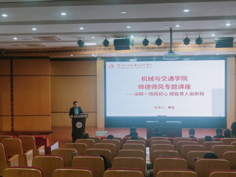 4月22日,机械与交通学院邀请全国劳动模范、全国技术能手、江苏大工匠、正高级工程师黄俊老师以《深耕一线践初心 赋能教育启新程》为题作师德师风专题讲座,讲座由学院党总支书记唐一鑫主持。